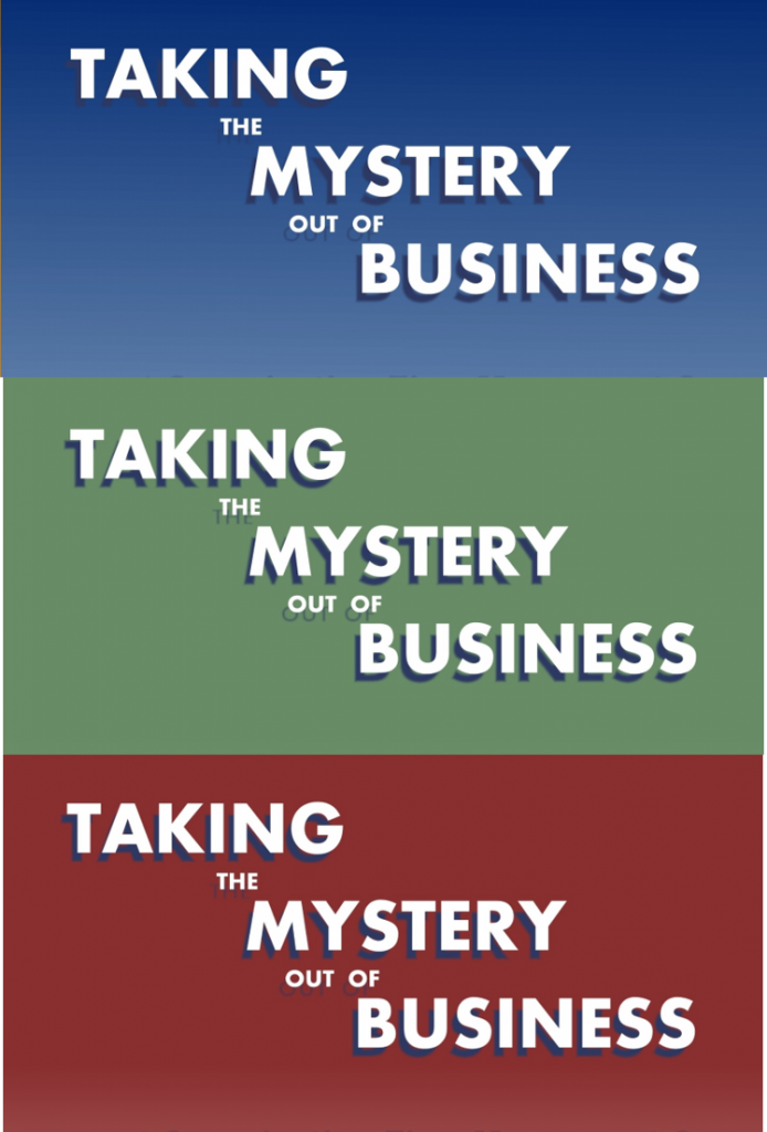 Many thanks to cover artist, Shawn Jewett, for designing the cover for the 2nd edition of Taking the Mystery out of Business, which will be released in mid-April. I can’t decide which color I like best, can you help me decide? I’ll announce the “winning” book cover late in the day on Wednesday, March 18th.